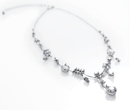 De blanke stenene reflekterer lyset på en nydelig måte og gir kjedet et luksuriøst uttrykk som passer perfekt til både brudekjoler og selskapskjoler. Den unike utformingen gjør smykket til et statement som fremhever utringning og ansikt på en elegant måte.